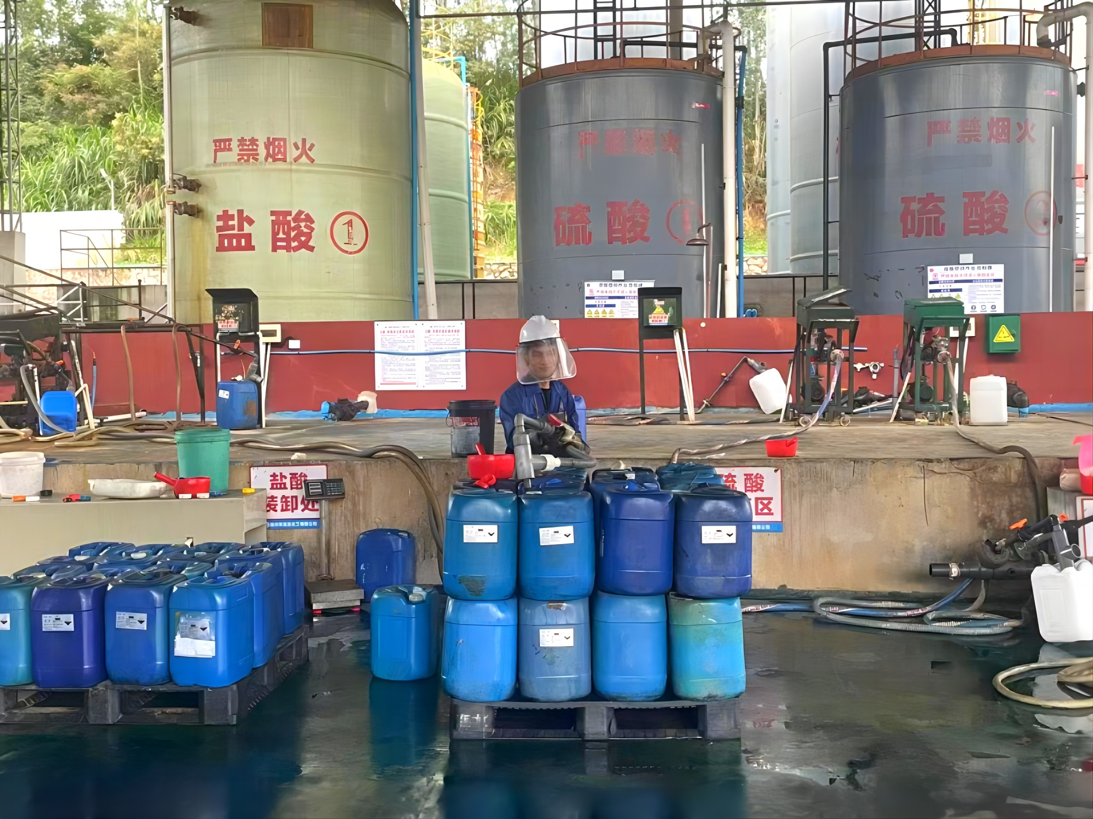 模擬車間人員因操作不慎,硫酸飛濺到身上,迅速脫去身上被污染的衣服,迅速關(guān)閉充裝開關(guān),用毛巾擦干凈后安排到淋浴器進(jìn)行沖洗,沖洗時(shí)間30分鐘以上并涂燙傷膏。