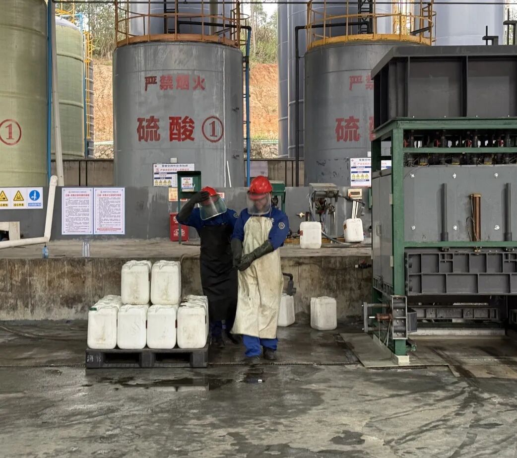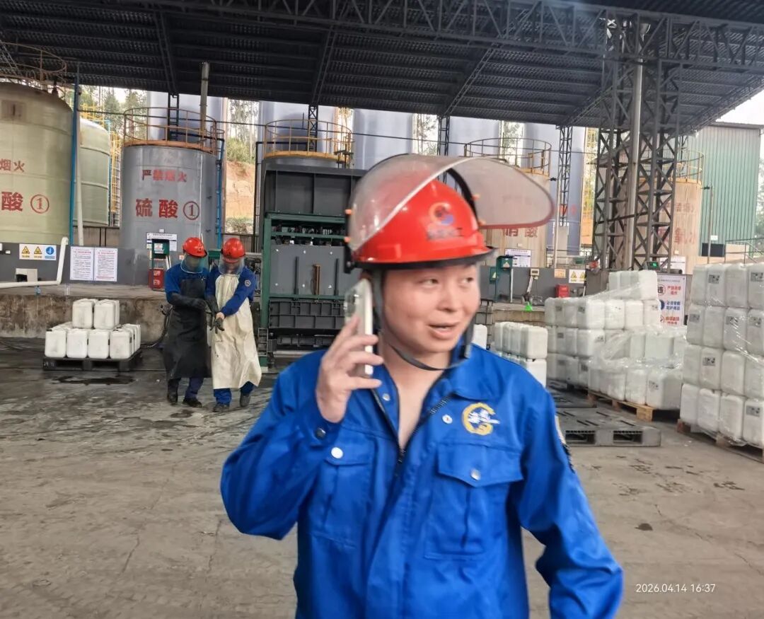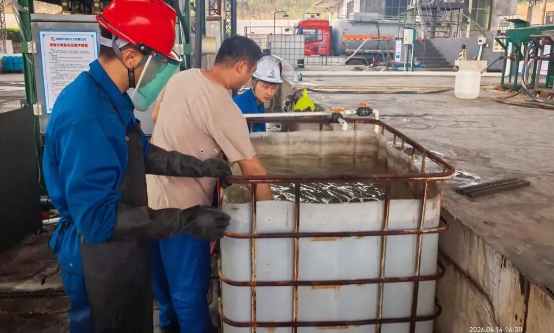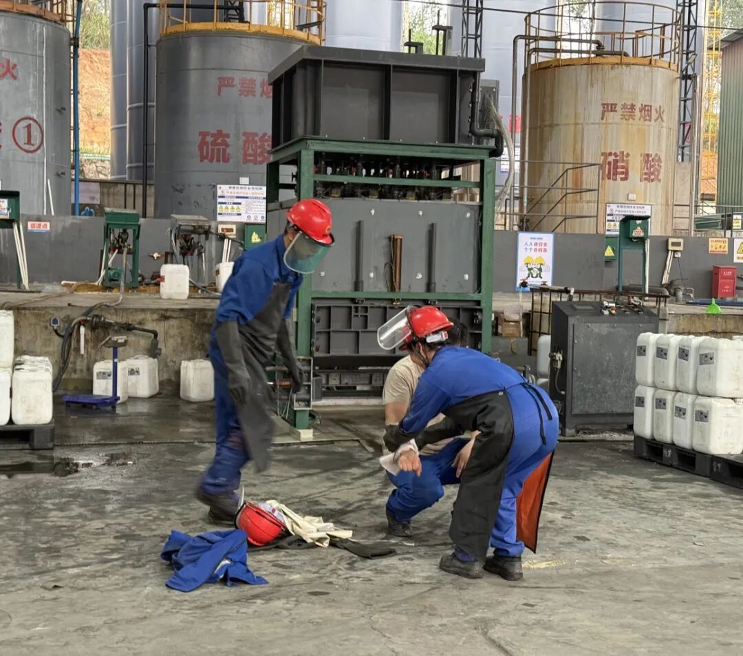 模擬三酸車間員工進(jìn)行硫酸充桶作業(yè)時(shí)未佩戴防護(hù)用品,因操作不慎,導(dǎo)致大量硫酸飛濺到身上,受傷員工立即大喊:“被硫酸噴到了”,并第一時(shí)間脫掉被污染的衣物。