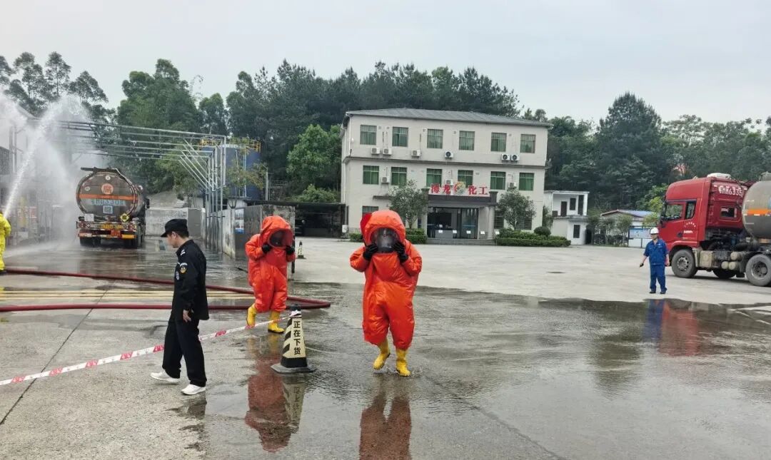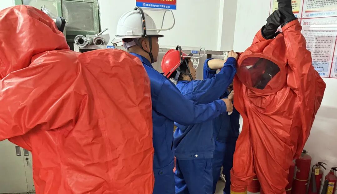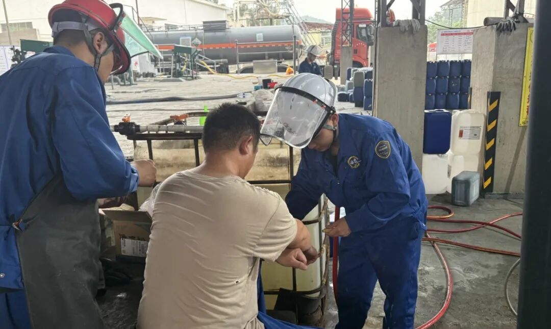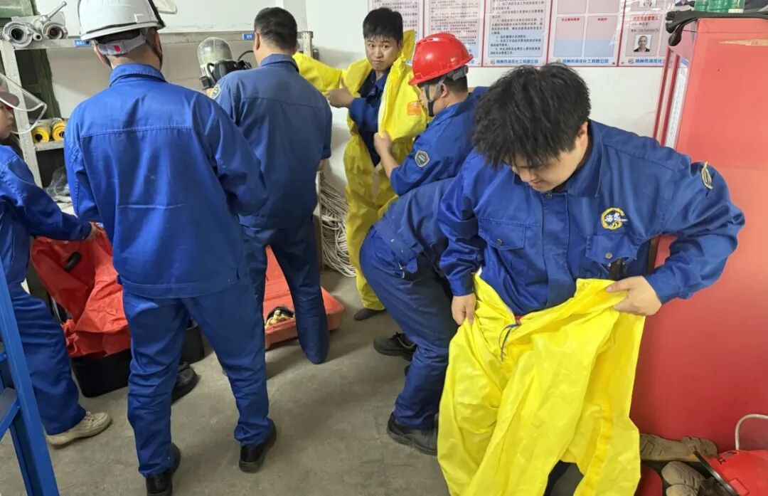 后勤保障組配合搶險(xiǎn)救災(zāi)組人員穿戴好重型防化服后,立即趕赴現(xiàn)場對泄漏部位進(jìn)行堵漏作業(yè)。