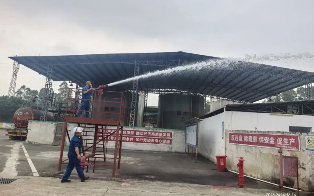車間主任接報(bào)趕赴現(xiàn)場后啟動(dòng)現(xiàn)場級預(yù)案,實(shí)施現(xiàn)場應(yīng)急處置搶救傷員。由于現(xiàn)場自動(dòng)噴淋系統(tǒng)故障,嘗試手動(dòng)開啟,因泄漏量太大,無法壓制,請求公司支援。